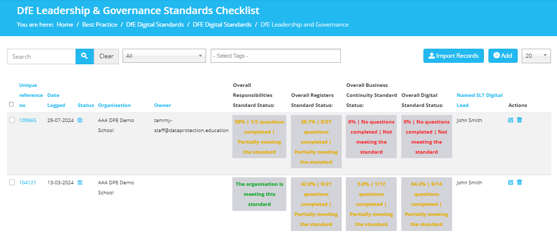 Once you have assigned your SLT Digital Lead, we recommend that you start with the Leadership & Governance Standard tracker which we have given to all our customers as part of their current SLA. (Customers can access the tracker via the Schools & Trusts Best Practice Area and then going to 'DfE Digital Standards). Each question is set up in the tracker, where you can record your answers and check progress and report to SLT and the board your progress: